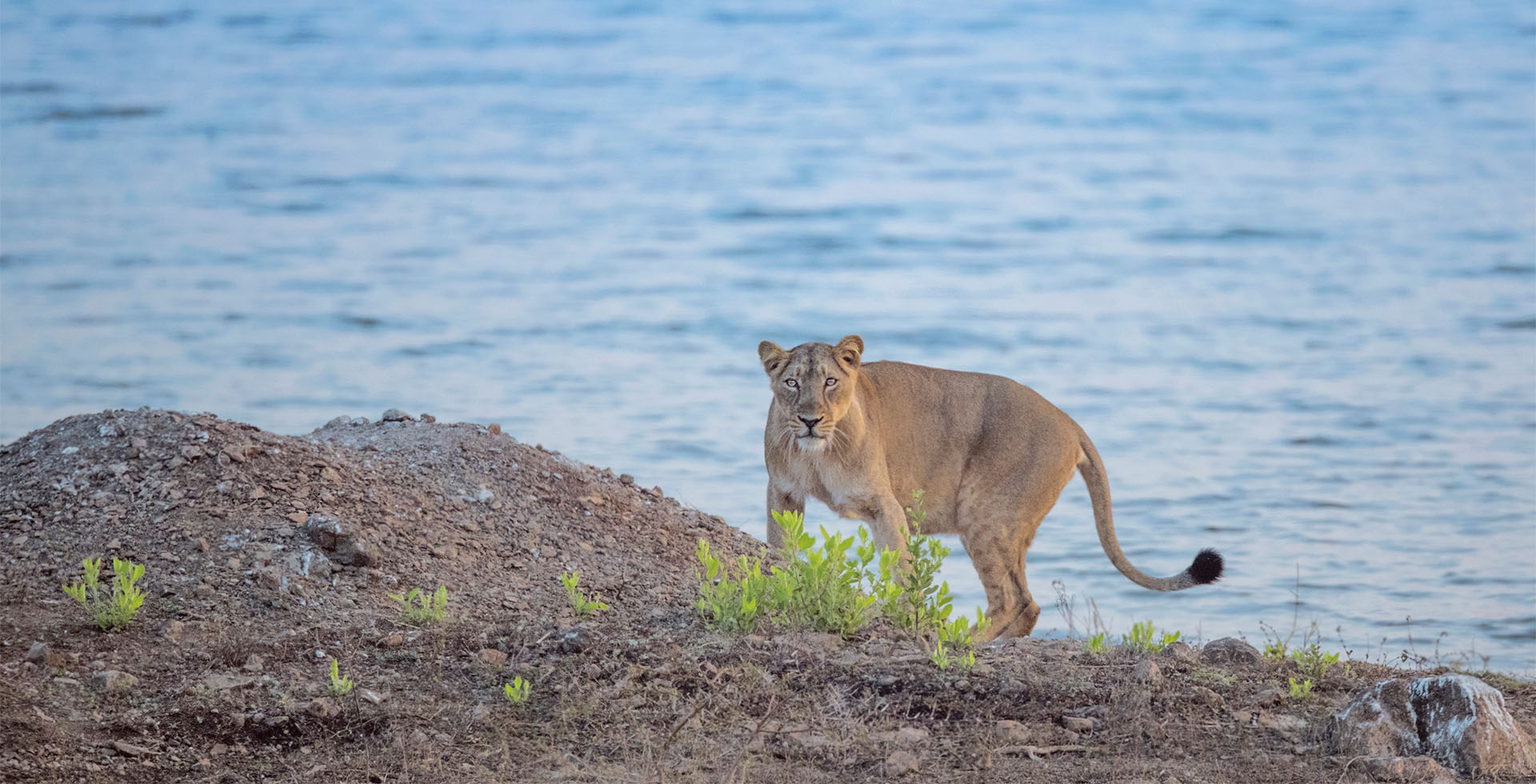 One early morning, I crossed path with a lioness and the reservoir backdrop in Gir National Park, India.