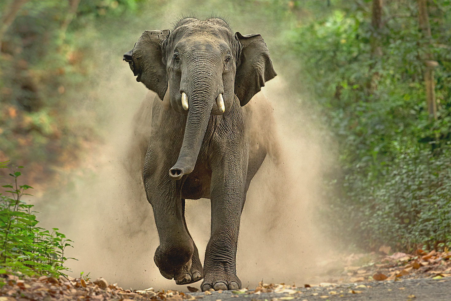In the summer months, Corbett Tiger Reserve, Uttrakhand, gets a lot of elephant herds coming to its grasslands. One young migrant wanted to enhance his skill set and mock charge us. I had a long telephoto lens and was parked at a safe distance but the earth shaking and dramatic events caused by the elephant charge got framed!